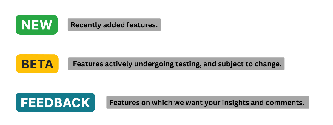 Feature Labels help you to identify and understand new functionality, and make it easy to provide valuable feedback that will contribute to improving a feature on SimplePay. These labels serve as visual indicators to help you understand and interact with three types of features:
